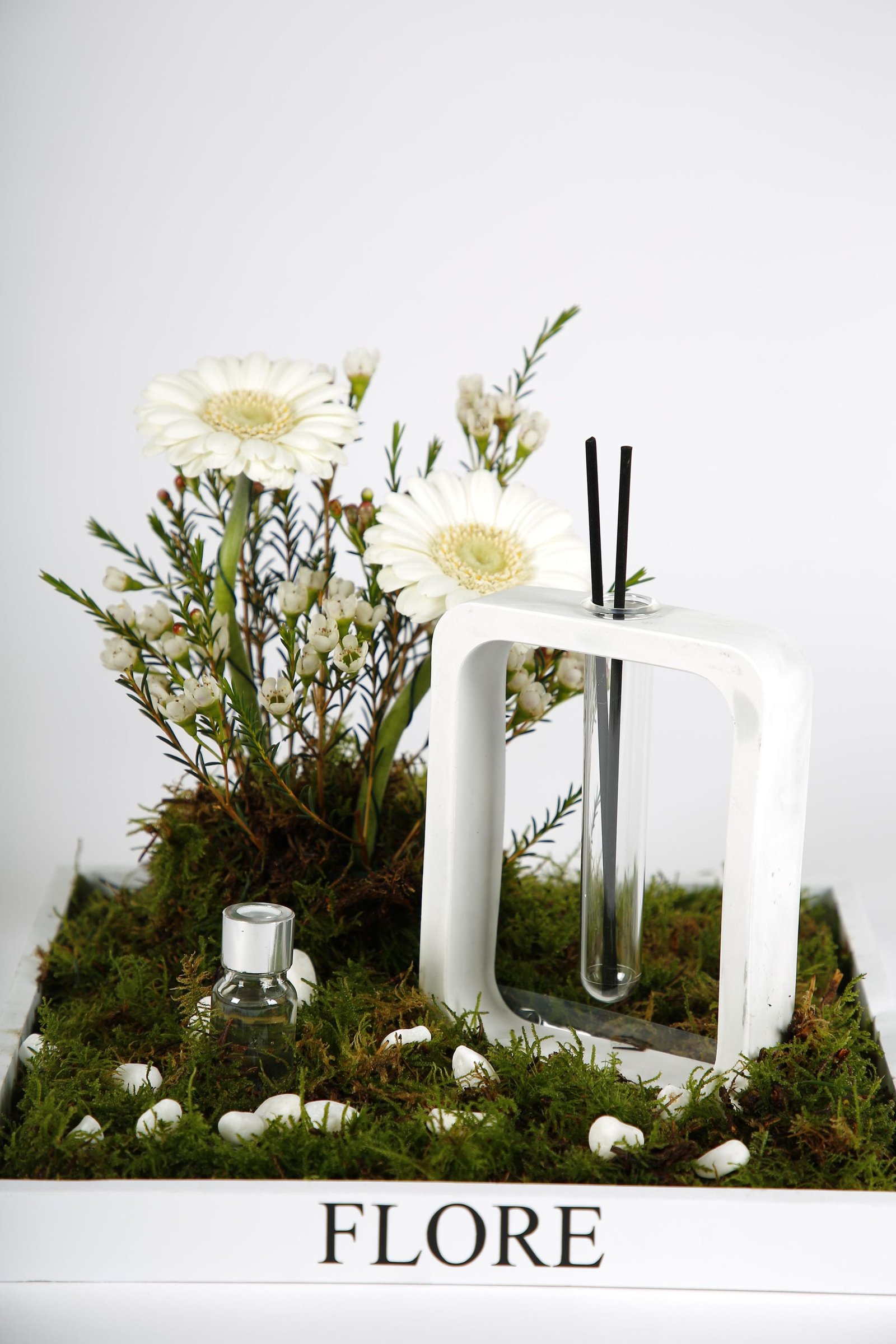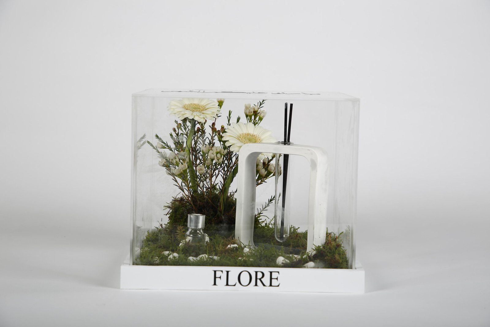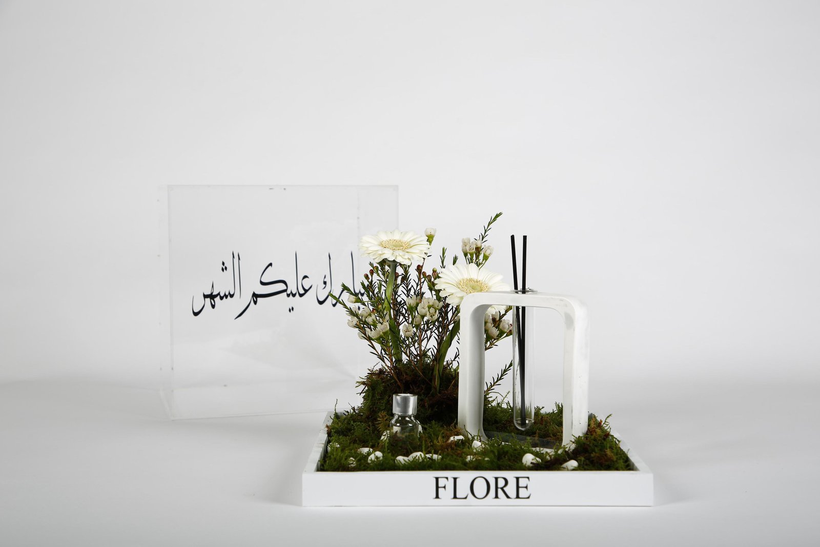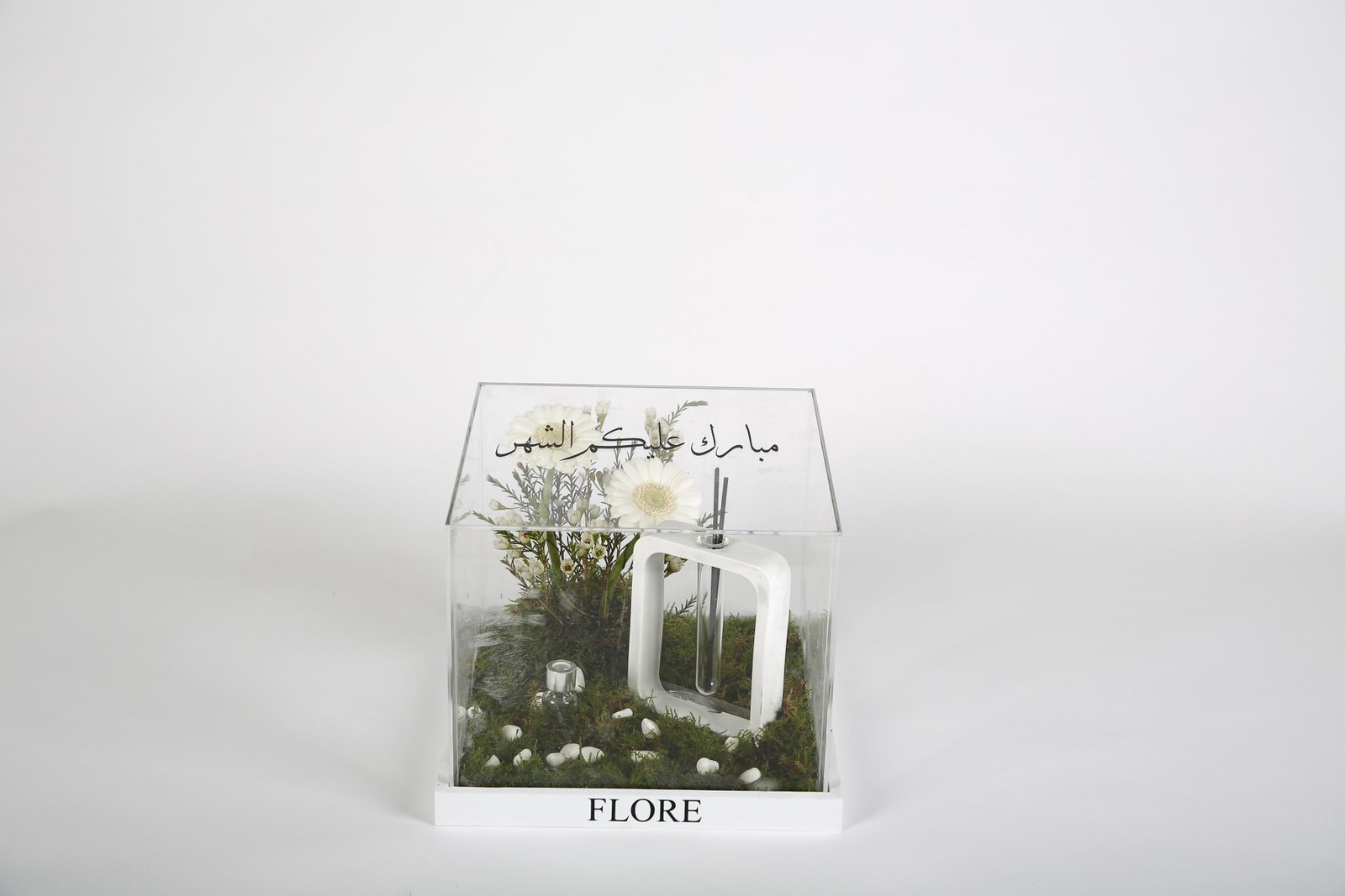 The product includes: •Reusable acrylic box, size (20*25*25) •Diffuser stand with the scent of oud •Natural rose